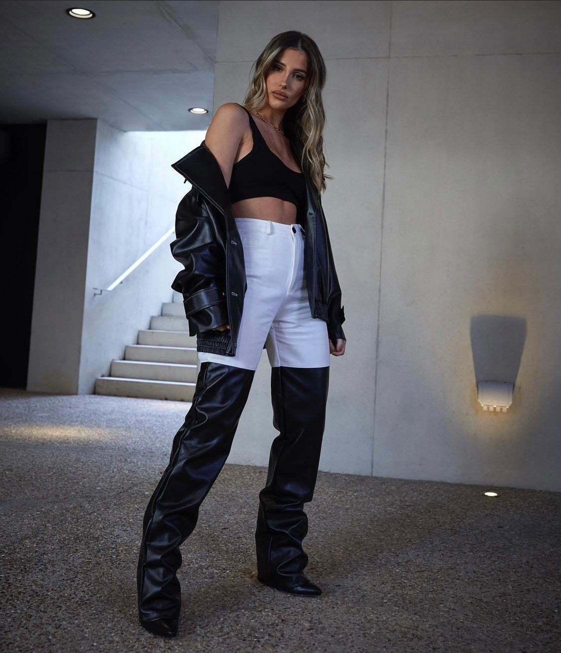 PANTALONI 'DOUBLE UP' - Pantaloni denim alb + piele neagra