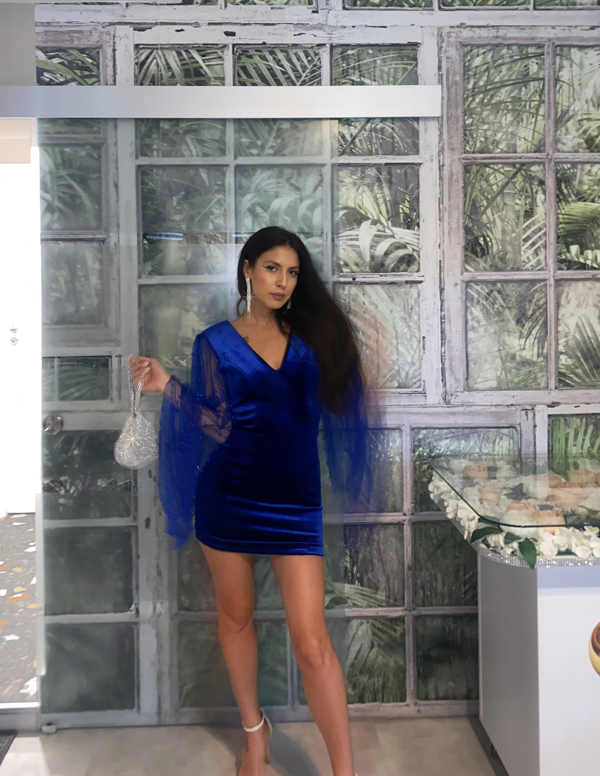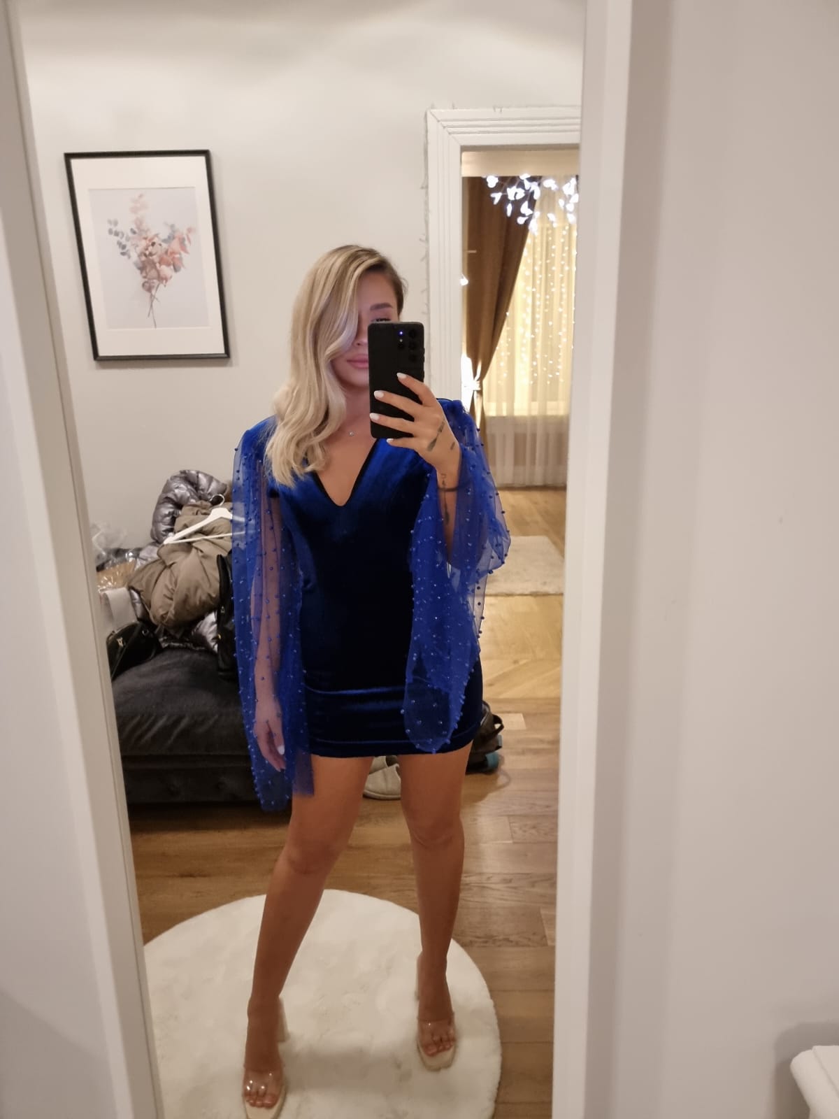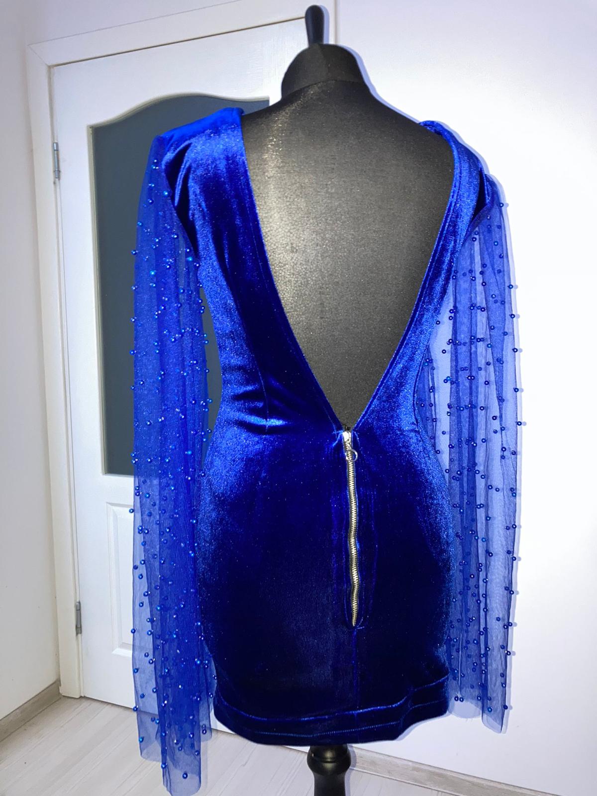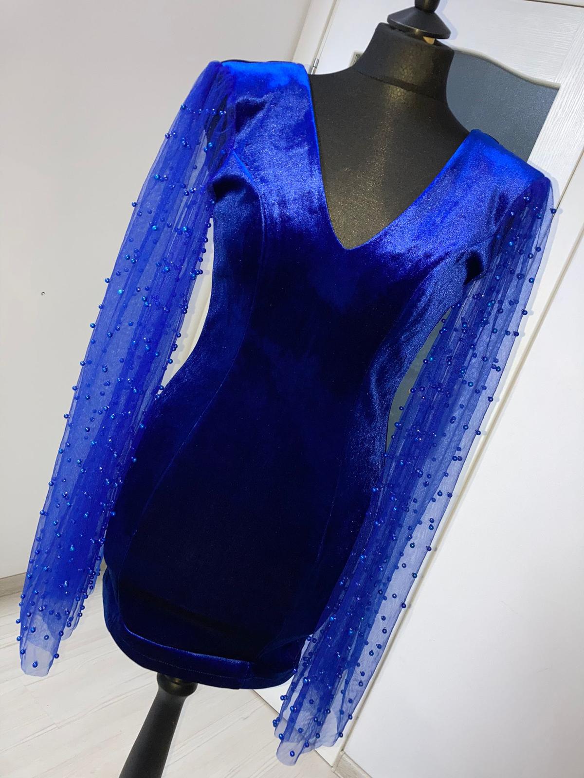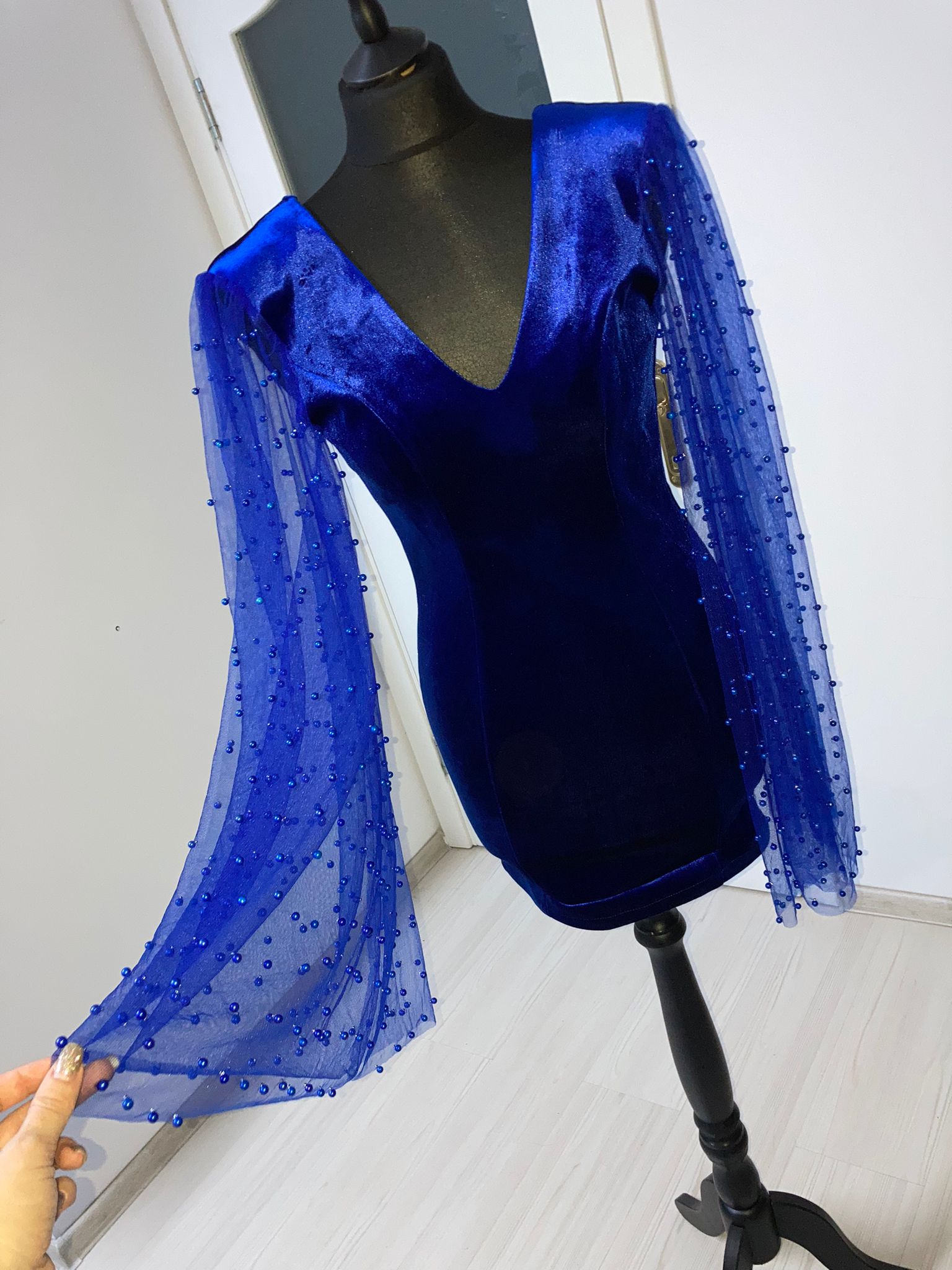 Rochie 'Blue Pearls' din catifea si maneci din tulle cu perle